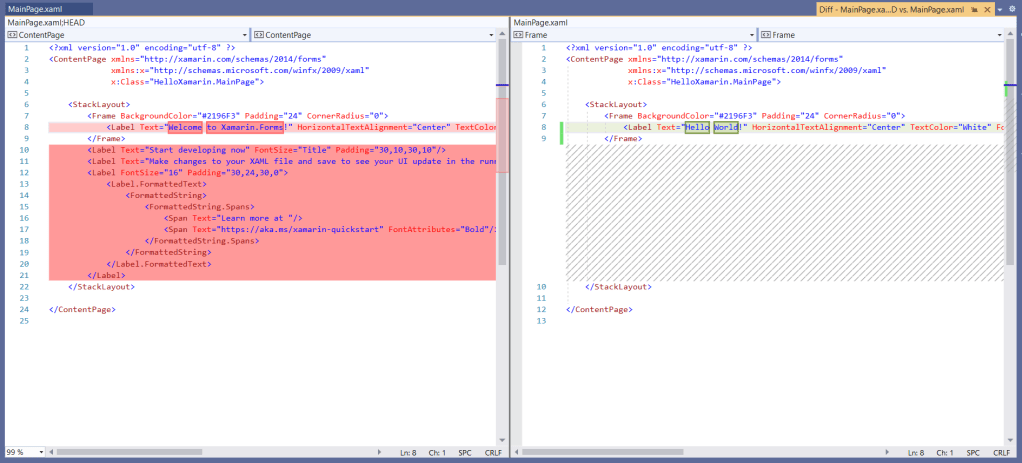 So let’s open MainPage.xaml from the Solution Explorer and let’s replace the text Welcome to Xamarin.Forms! with our Hello World! and remove the unnecessary code.
