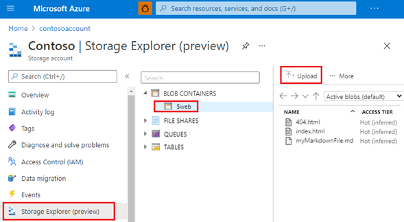 Once you have enabled the Static website option, the only thing left to do is to upload your static website files. You can do this very easily using the Storage Explorer which is built into the Azure portal.